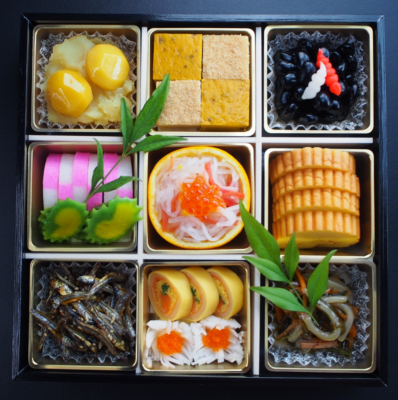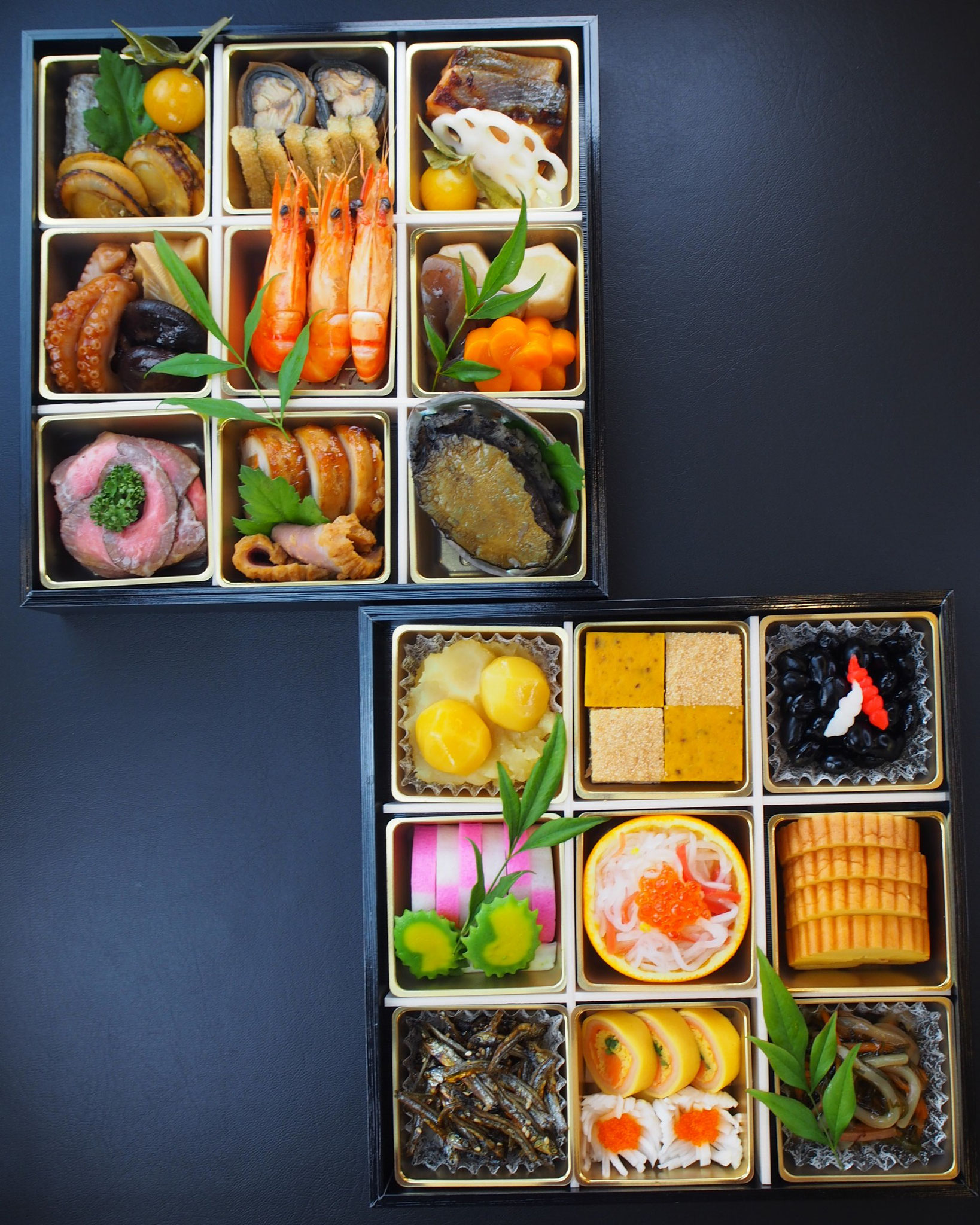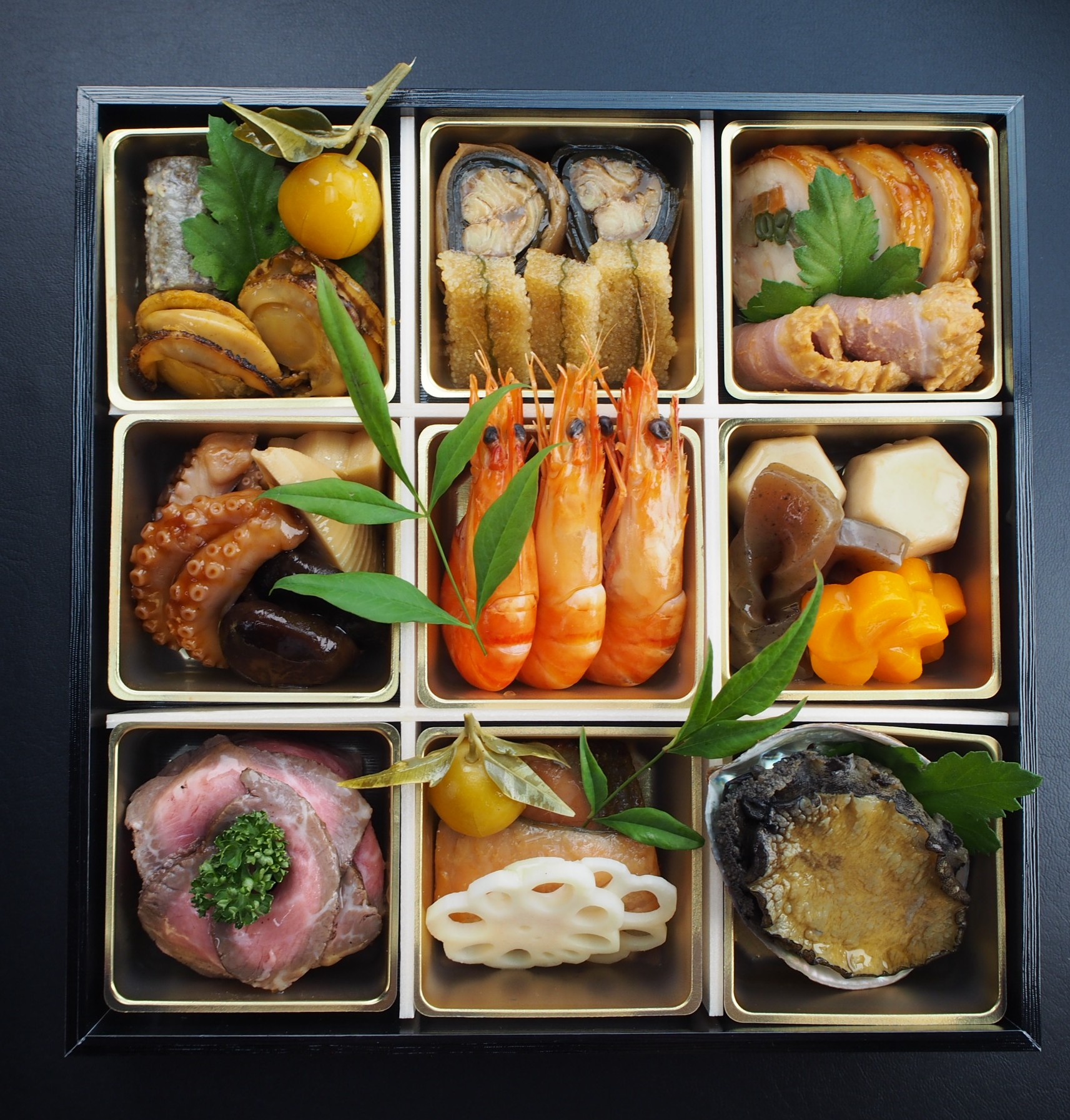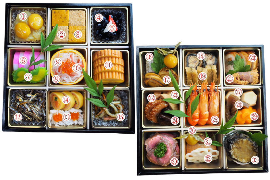 ㉖金柑蜜煮 ㉗里芋 ㉘手綱蒟蒻 ㉙梅人参 ㉚自家製ローストビーフ ㉛鮭の西京焼き ㉜花蓮根 ㉝鮑柔らか煮
